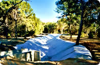 The use of the "Grout Matt" system as a lining will not impose any extra restrictions beyond those basic design considerations. The installation and performance of the mattress is not inhibited in any way by the shape and size of the channel. The main requirement of the "Grout Matt" system is that all slopes are naturally stable and that any introduced fill is well compacted to 98% optimum. Therefore, the only design decision to be made in relation to the lining of the channel is as to which style of mattress to use. The Filter Point (F.P.) mattress is woven together at regular intervals to form Filter Points, which remain free of grout. These Filter Points allow water to permeate through the mattress to relieve hydrostatic pressures, while holding back even the finest soil particles. The inflated F.P. mattress has a dimpled finish and a Manning's 'n' between 0.025 - 0.03 is suggested. The other style of mattress is the Uniform Cross Section (U.C.S.) mattress. This mattress has no Filter Points, with the two layers of fabric being held together by diagonal restraining ties spaced at regular intervals. Hence, the mattress inflates to a constant thickness forming an impermeable lining, whilst the restraining ties act to reinforce the structure. This mattress has a much smoother finish giving a Manning's 'n' of approximately 0.016. It also allows for traffic from maintenance vehicles without any damage to the integrity of the system as well as preventing the flow of water without the need for an impermeable liner. The majority of canal/channel/ river linings would be carried out with the 200 mm Filter Point, depending on flow velocities and soil conditions. Although were a more natural looking side slope is required, our growth matt is utilised. The Collapsible block mattress is also used where large settlement is anticipated. It is also possible to combine the two styles of mattress using the Filter Point mattress on the sides of the river and the Collapsible Block mattress on the toe. This allows for consideration of frictional aspects as well as maintaining subsoil drainage. The Collapsible Block mattress allows for settlement at the toe in case undermining occurs. In cases where flow energy needs to be dissipated, the cobbled surface of the mattress will help in a minor way. Where stronger means are required, stilling basins, weirs or other features can be incorporated into the lining because of the versatility of the Grout Matt system. Any side channels entering the main channel can be easily incorporated into the lining, also feeder pipes or culverts can be encased in a absolutely watertight fashion by the mattress. Site Preparation